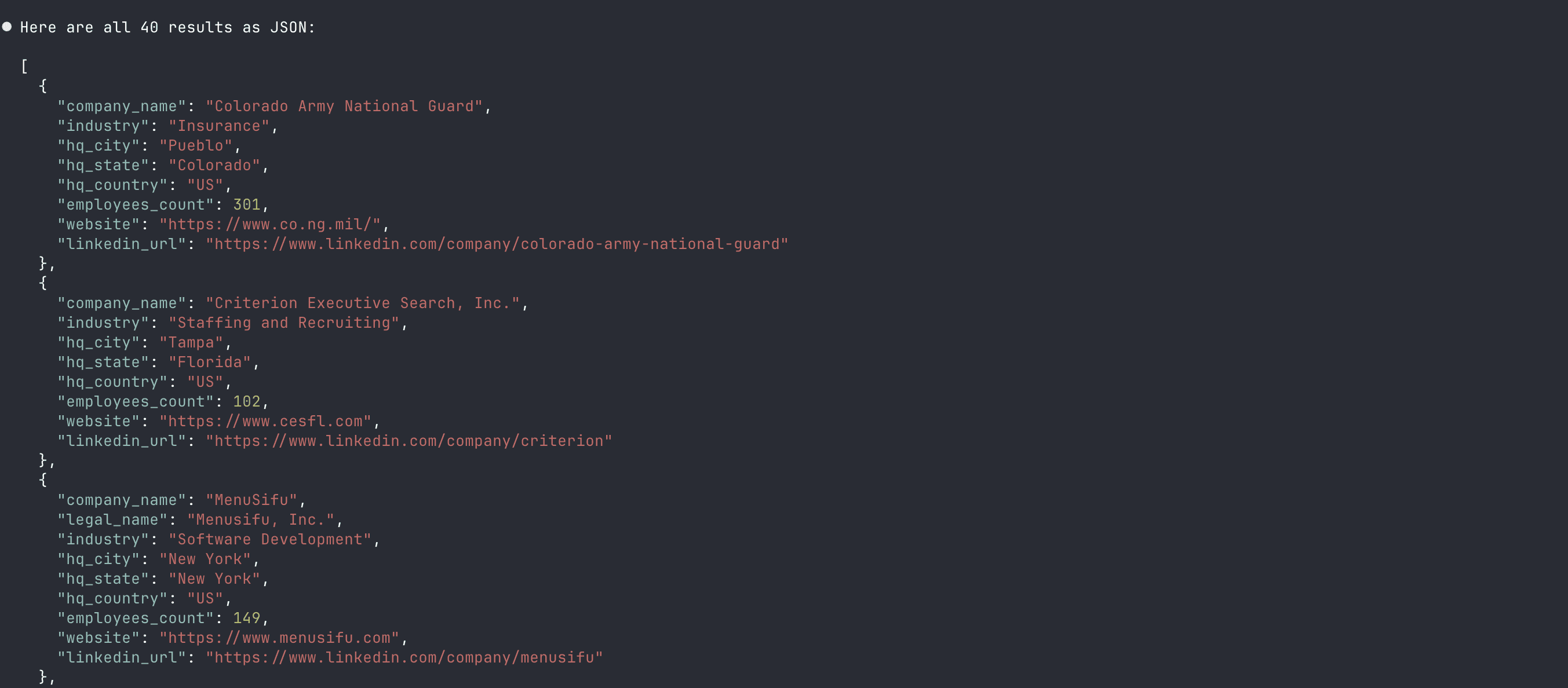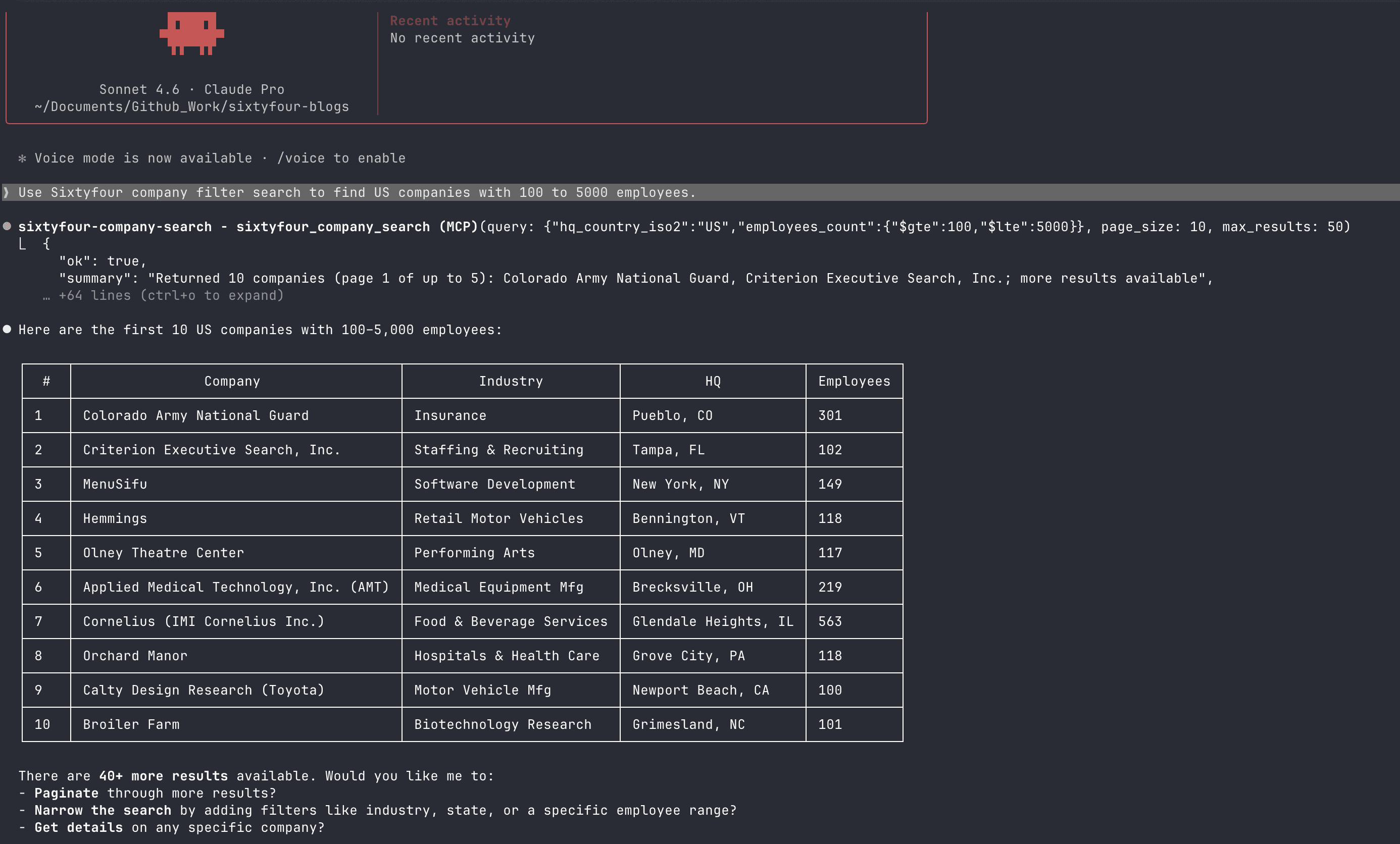 The Company Filter Search MCP is where things get genuinely useful for engineering workflows. You can drive the full search flow — discover available fields, inspect top values, build paginated queries — in plain language.